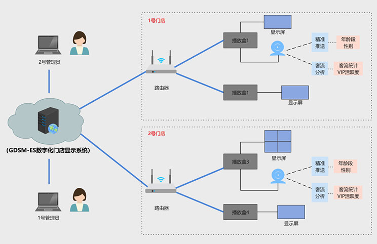 该客户为宁波地区零售门店,在一段时间内,客户发现门店销售额持续下滑,但是不知道原因出在哪里,到底是消费者减少,还是广告推送出现问题,亦或是其他原因,客户没有头绪,CA88(中国区)科技数据化门店显示系统完美的解决了客户痛点,方案拓扑图如下: