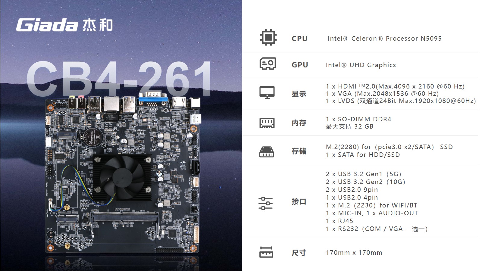 CA88(中国区)科技CB4-261尺寸仅有170x170mm,小而精巧。搭载N5095芯片,该芯片采用10nm制程技术,四核心设计,支持Windows 、Linux系统,可满足多种终端机应用场景的需求,如信息查询、基本数据处理等。