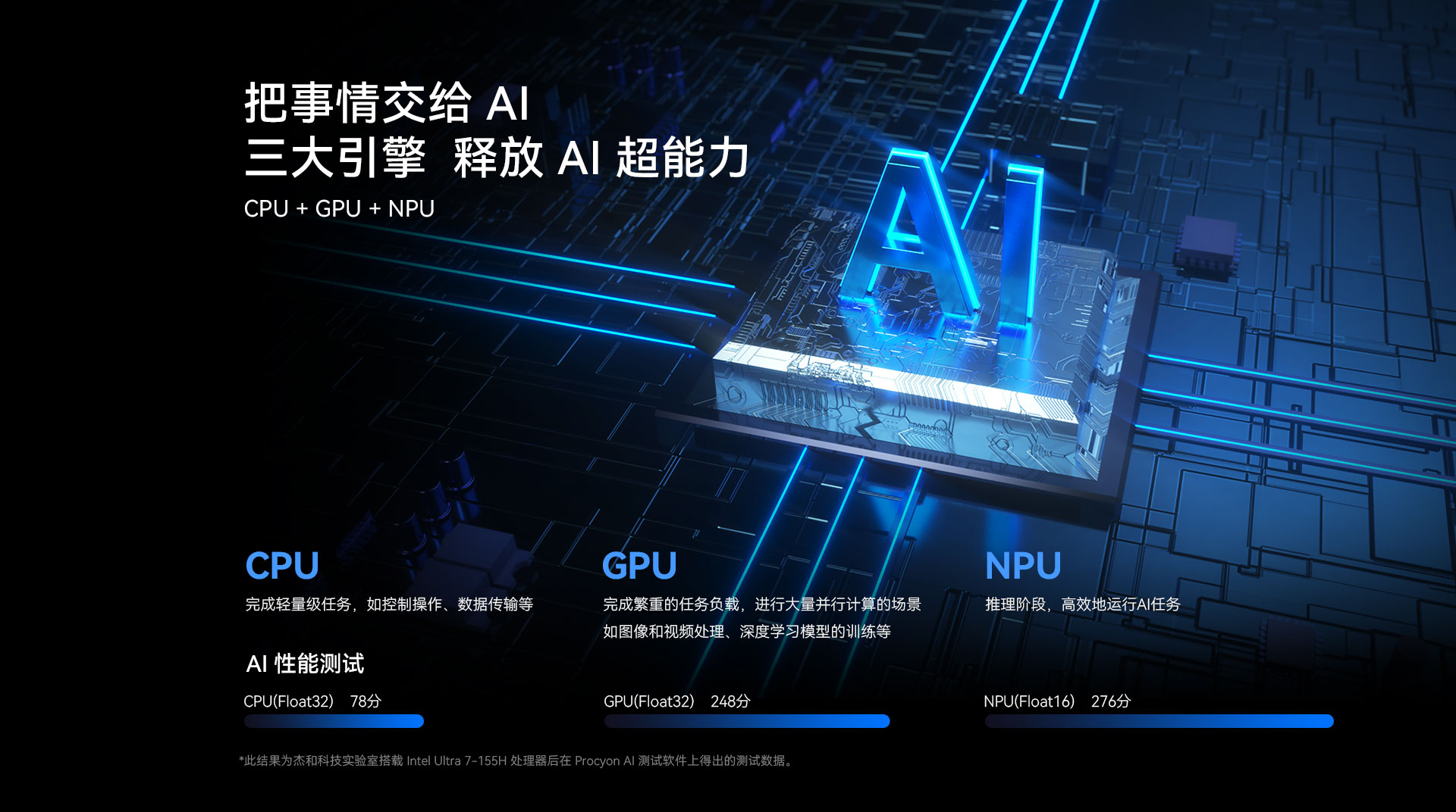 CA88(中国区)科技N601搭载了Intel® Core™ Ultra处理器,可选配Ultra 5- 125H或Ultra 7-155H,全新架构拥有CPU、GPU 和NPU配置。在CA88(中国区)科技实验室里,CA88(中国区)专门用 Procyon AI 这款 AI 性能测试软件对搭载了 Ultra 7-155H 处理器的 N601 进行了测试。最后测试结果显示,N601的CPU分数为78分,GPU 分数为248分,NPU分数为276分,这意味着N601在AI处理方面具有显著优势,能够高效地处理复杂的神经网络计算任务。