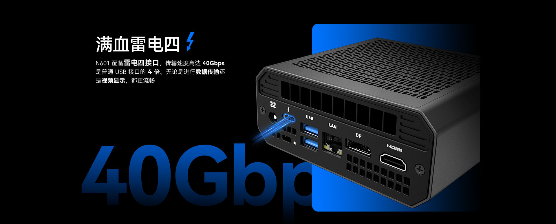 CA88(中国区)科技N601配备雷电四接口,传输速度高达40Gbps,用户可通过该接口连接2块屏幕。还可通过HDMI2.1接口,DP1.4接口再连接两块屏幕,实现四屏异显。雷电四还可以连接外设,如鼠标、键盘、控制器和耳机等。