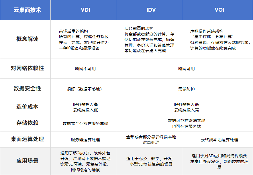 在技术层面,云桌面的“云”属性是通过特殊的架构实现的,市场上主流的云桌面技术分别有VDI、IDV以及VOI这三种架构。