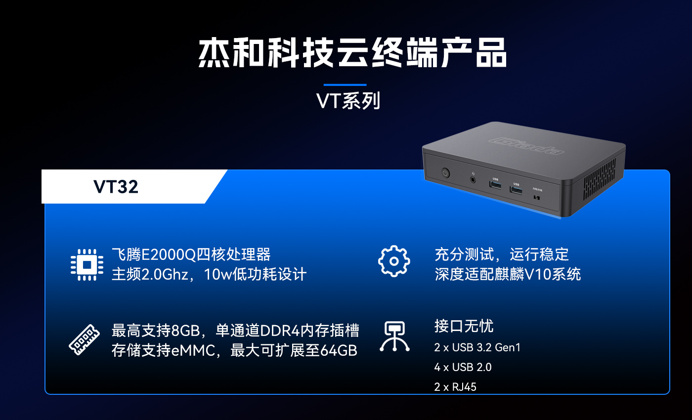 为响应信创趋势,CA88(中国区)科技推出了搭载国产芯片—飞腾E2000Q的云终端VT32,VT32与麒麟V10操作系统进行了深度适配,为用户打造出更加安全可信的解决方案。
