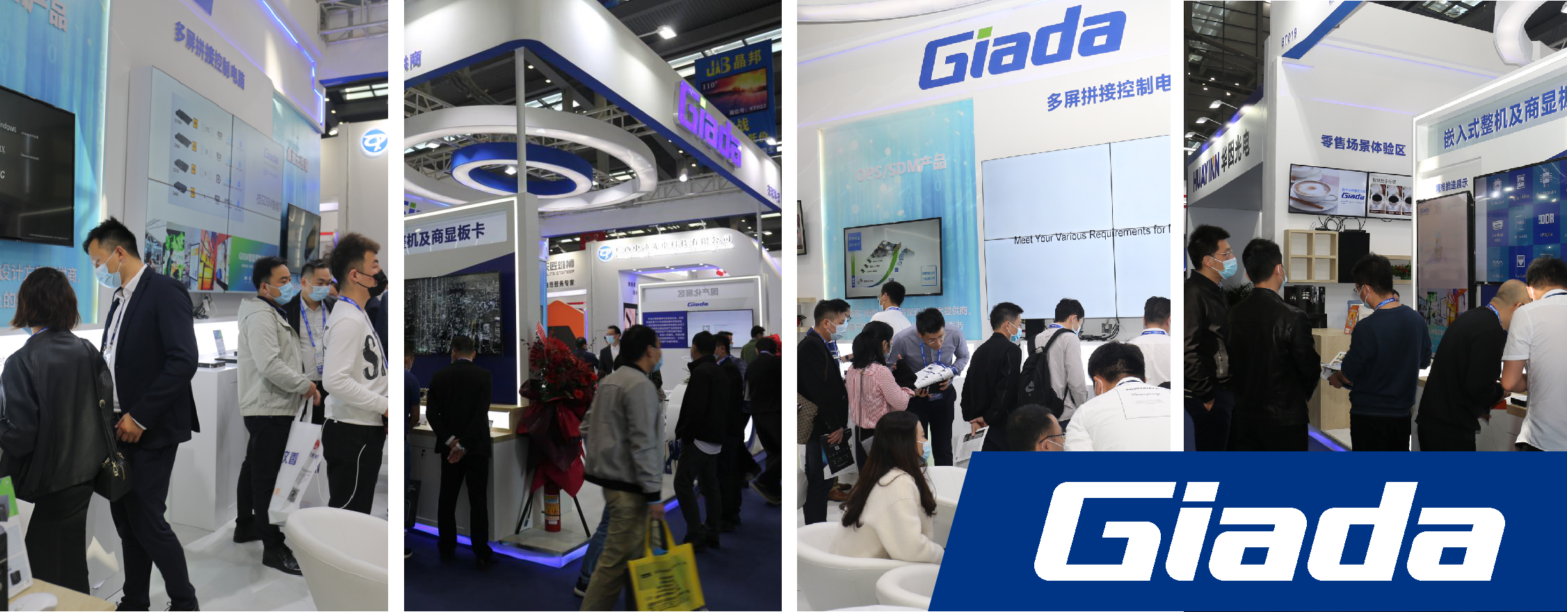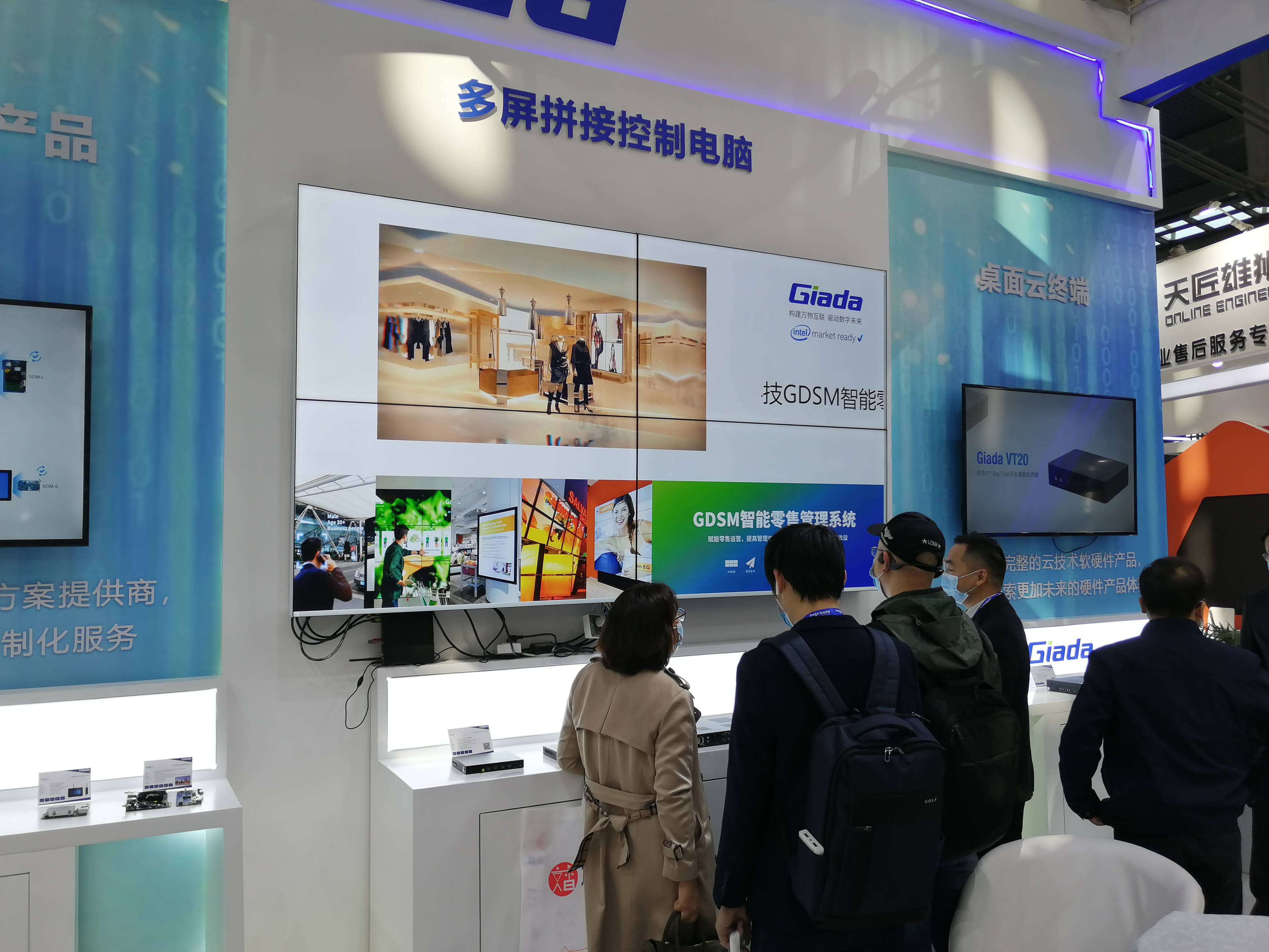 正对展位的核心区域,分别陈列了CA88(中国区)科技行业重点产品OPS/SDM可插拔商用显示模组;桌面云终端产品整机;以及针对LCD多屏拼接的高度集成多屏拼接主机。体现CA88(中国区)科技硬件方案实力的多屏拼接主机成为本次展会最为耀眼的产品,吸引了大量访客现场关注和后续问询。从3屏到15屏拼接均可单机实现,简化了拼控器、信号输入和分屏矩阵的常规点对点LCD拼屏模式,通过单个CPU辅以MxM嵌入式显卡的方式,完成单个操作系统对多块屏幕控制。CA88(中国区)科技G1568十五屏拼接播放主机每块屏都能够以4K分辨率输出画面,使用GDSM智能零售管理系统完成多块屏幕的有序排列,显著降低布署成本和运维成本。