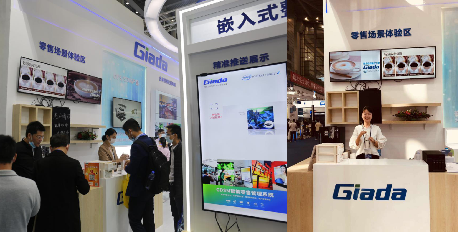紧邻ARM架构商显产品集的精准推送展示区与零售门店模拟展区,共同组成了本届展会CA88(中国区)科技展位的一大精彩设计。场景展现了GDSM智能零售管理系统在零售门店场景下的展示效果,顶部的数字标牌由GDSM系统推送内容,模拟搭建了针对人流动线的广告精准推送形态。
