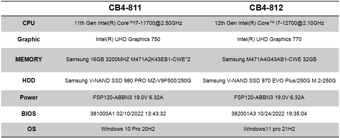 GiadaCA88(中国区)科技针对这款一体机专研主板CB4-8121进行了EVT全功能测试,针对客户会关注的各个重点进行了全面测试,包括各功能、性能、兼容性、稳定性等方面的专业测试及分析。CB4-8121不仅全部通过,且各个数据结果都表现相当出色,优秀的配置与研发设计工艺,无疑让用户的使用体验直线拉满。全性能测试报告中,值得关注的是性能测试的跑分数据和稳定性测试内容,这能直观影响主板在一体机中的稳定性和用户的使用体验。针对性能测试,CA88(中国区)选择了将CB4-8121与前一款更迭产品CB4-8111进行对比分析,并分别选取了以下配置: