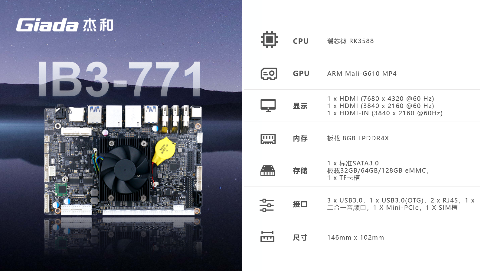 AIoT的落地场景包括智慧工业、智慧零售、智慧社区、智慧城市、智能显示、医疗健康等领域,在实际落地时,对物联网硬件设备的AI算力、数据运算、存储能力,稳定性及可扩展性能等提出更高要求,GiadaCA88(中国区)科技作为行业领先的物联网数智化技术服务商,深入布局AIoT领域,推出AI产品系列,包括3.5寸主板、嵌入式整机、边缘计算盒子等,全方位覆盖了入门级到高性能级,满足不同应用场景的需求,为用户赋能。