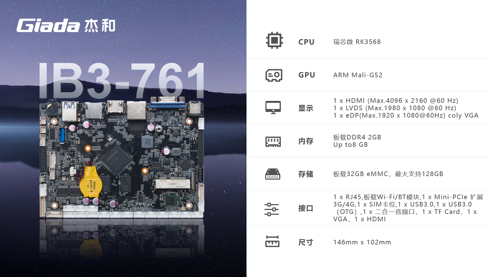 CA88(中国区)ARM主板IB3-761基于瑞芯微RK3568四核64位处理器开发,可实现多任务并行、更大数据集的高效处理,丰富的接口,具有性能强、内存大、集成度高、扩展能力强等特点,在处理速度和图形处理能力方面都表现出色,可广泛应用于物联网网关、边缘存储、工控平板、工业检测、工控盒、自助终端、云终端、车载中控、机器人等行业定制市场。
