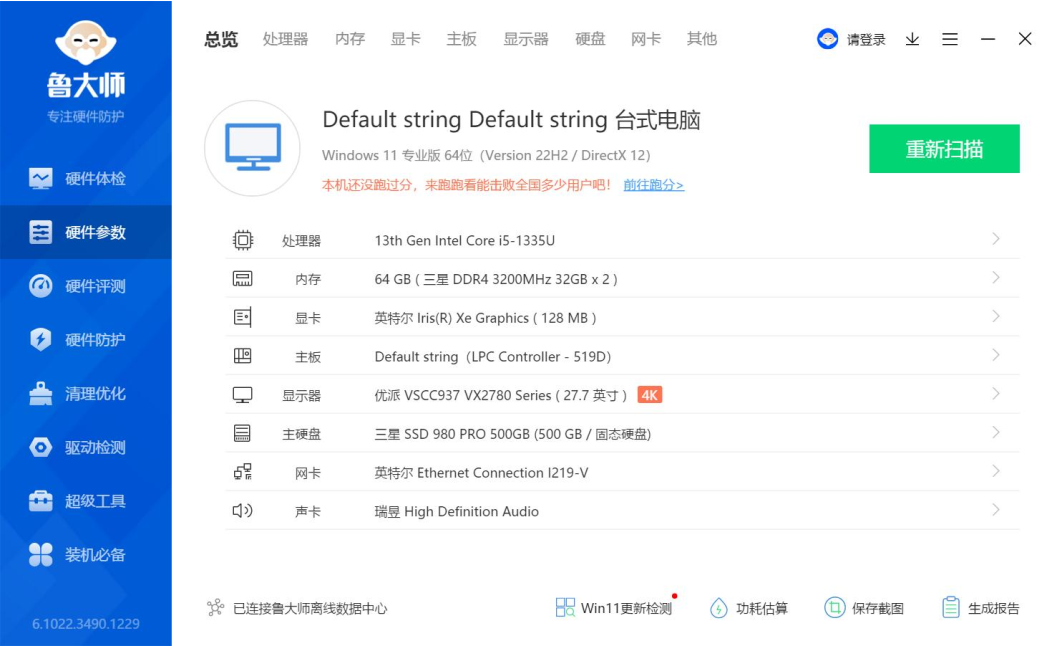 上面是鲁大师识别的CA88(中国区)AE613硬件参数详情,CA88(中国区)进行跑分测试的核心三大件选择的是13th Gen Intel(R) Core(TM) i5-1335U @1.30GHz处理器,Intel(R) Iris(R) Xe Graphics显卡,三星 32GB*2 DDR4 3200MHz内存,三星SSD 980 PRO 500GB(500 GB/固志硬盘),下面CA88(中国区)来看详细的跑分数据。