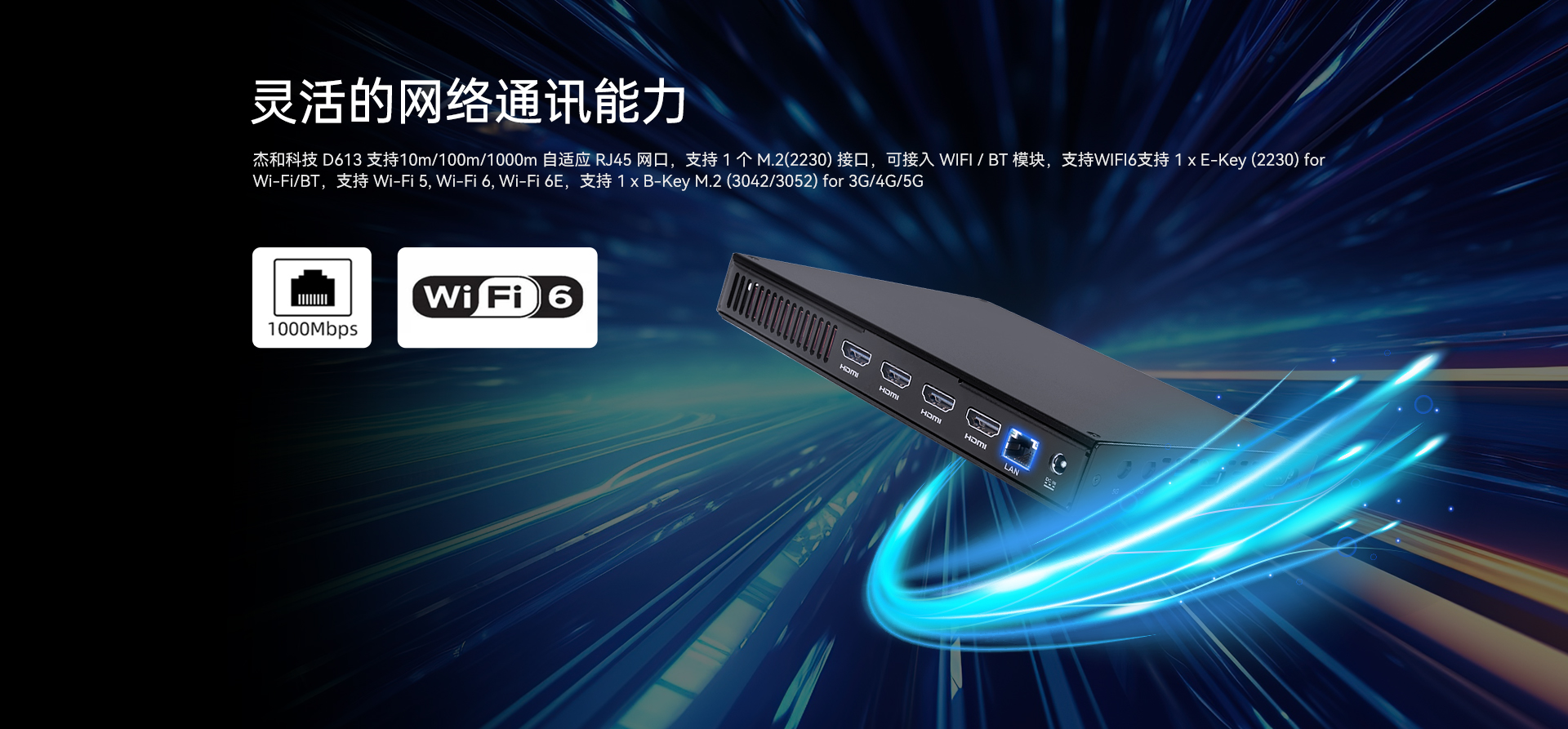 1 x E-Key(2230)for Wi-Fi/BT,支持 Wi-Fi5/6/6E(CNVi)